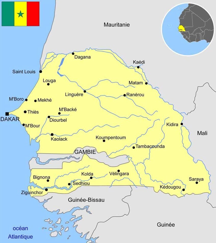Sur une carte, le Sénégal évoque une tête présentant son profil gauche. La presqu’île du Cap-Vert (qui porte Dakar, la capitale) en serait le nez pointu, et la bouche la Gambie (cette ancienne possession britannique forme une enclave de 300km sur 50 autour du fleuve éponyme).