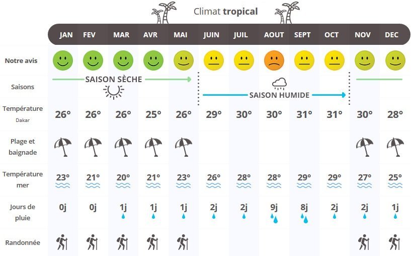 – La saison des pluies, entre juin et octobre, apporte chaleur et pluie. Le thermomètre grimpe à 30°C et les pluies font leur apparition. Ces précipitations ne durent pas très longtemps et généralement laissent place à un soleil généreux. C’est pourquoi cette saison des pluies n’est pas complètement déconseillée pour découvrir le Sénégal.