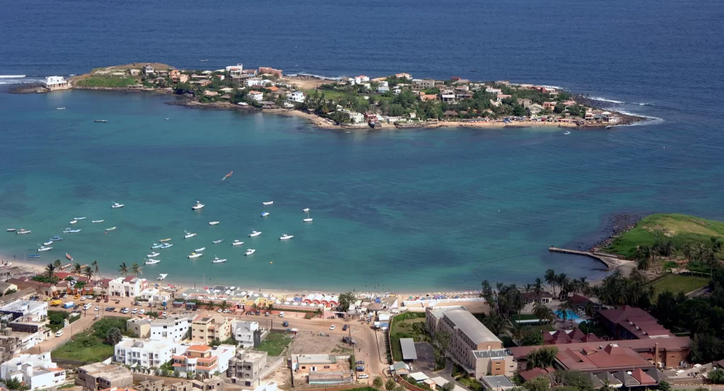 À bâbord, l’hôtel Diarama, vestige austère des débuts de l’ère touristique au Sénégal. À tribord, le Club Med, qu’on ne présente plus. Au milieu, le village de pêcheurs, avec par endroits ses allures de bidonville. L’île est comme un trait d’union entre la zone touristique et les quartiers populaires, un des rares endroits où les deux mondes se côtoient, le temps d’un week-end.